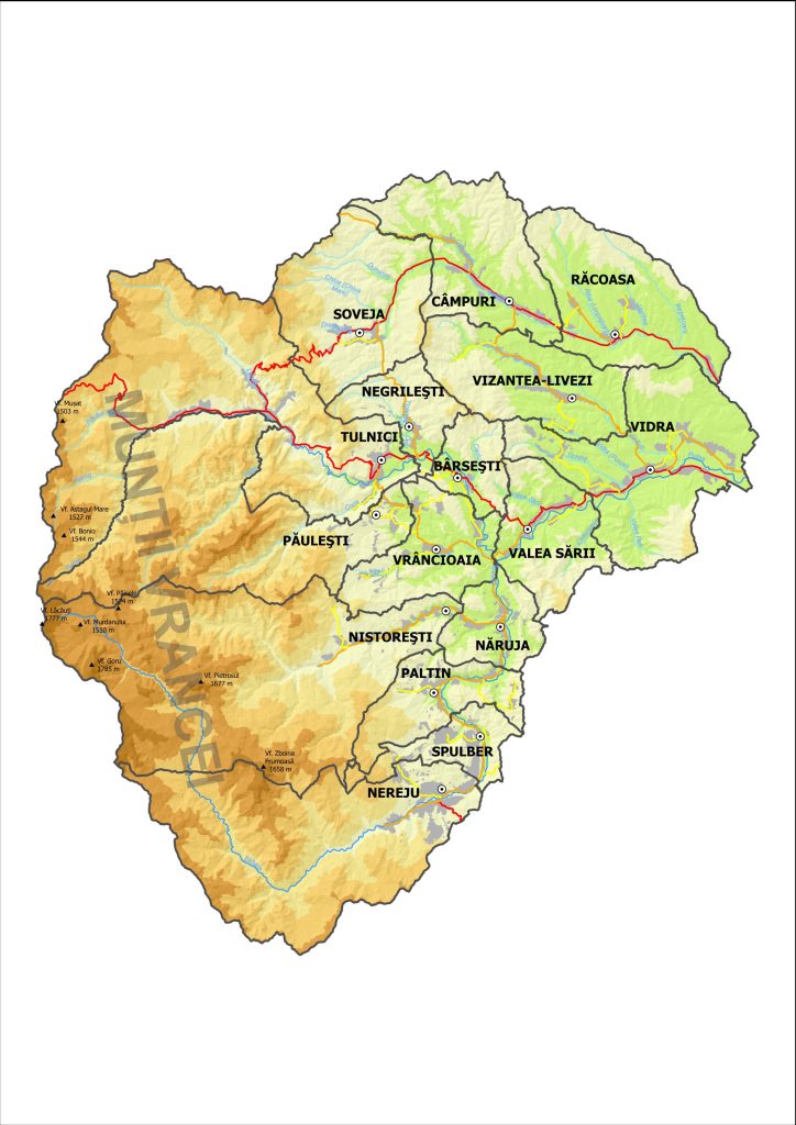 Principalele unități de relief sunt reprezentate de Munții Vrancei (Lăcăuți–Goru, Munții Lepșei, Zboina Neagră, Zboina Frumoasă) și de Depresiunea Vrancei și a Sovejei, care oferă o diversitate peisagistică importantă. Teritoriul se remarcă prin bogăția naturală – peste 105.000 ha de păduri, izvoare minerale la Vizantea-Livezi, dar și prin existența unor arii protejate și obiective naturale precum Cascada Putnei, Cascada Mișina sau Lacul Negru. Acestea reprezintă repere ale patrimoniului natural și contribuie la atractivitatea turistică a zonei.
